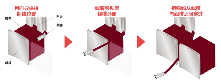 通过一边导向一边整列绕线,提高了占积率。由于线槽开口狭窄,所以齿槽对策方面有优越性。 因为在一体式铁芯上绕线,所以有利于磁电阻的最小化。