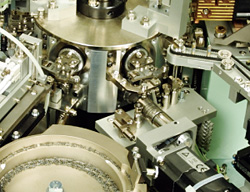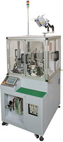 用同模电感绕线生产的高性能机器。 因采用了旋转方式,磁芯供给、绕线、溶接、磁芯排出各工程可同时运转,因而大大缩短了生产时间。 省空间、重量轻的小型机设计。 因旋转部采用的是DD伺服马达,可随时进行维护修理。 采用了日特独有的热压粘着方式,可自动调整加热片的个体差,使溶接温度稳定。 搭载有2台溶接单元,使开始线和结束线分别溶接,因而能提高品质的稳定性。 |